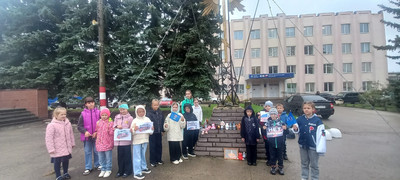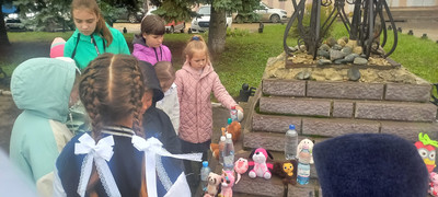 Школьники возложили к Поклонному Кресту мягкие игрушки и бутылочки с водой в память обо всех жертвах терроризма.
